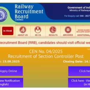 ഇന്ത്യൻ റെയിൽവേ സെക്ഷൻ കൺട്രോളർ തസ്തികയിലേക്ക് (വിജ്ഞാപന നമ്പർ: 04/2025) അപേക്ഷാസമർപ്പണം തുടങ്ങി. 21 റെയിൽവേ റിക്രൂട്ട്മെൻ്റ് ബോർഡു കളിലായി 368 ഒഴിവുണ്ട്. ഇതിൽ 19 ഒഴിവ്…