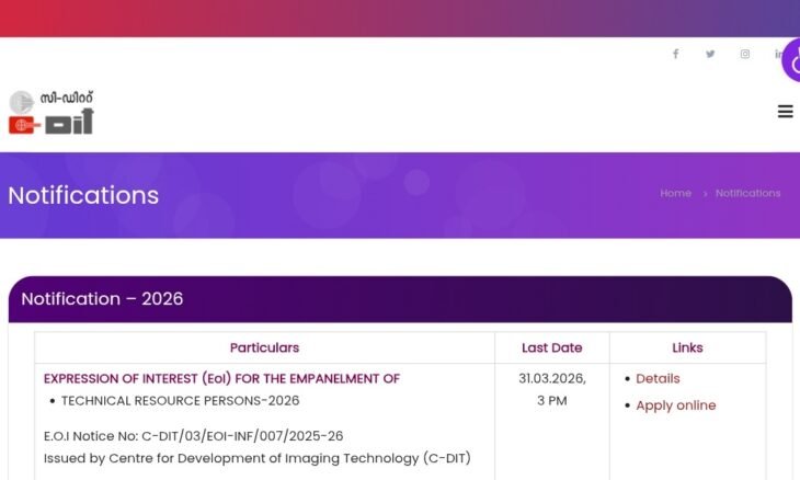 The Centre for Development of Imaging Technology (C-DIT) is inviting Expressions of Interest (EoI) for the empanelment of Technical Resource Persons to assist in various technical projects. This empanelment is for the year 2026. Eligible teachers and system administrators can submit their applications online through C-DIT’s official portal until March 31, 2026.