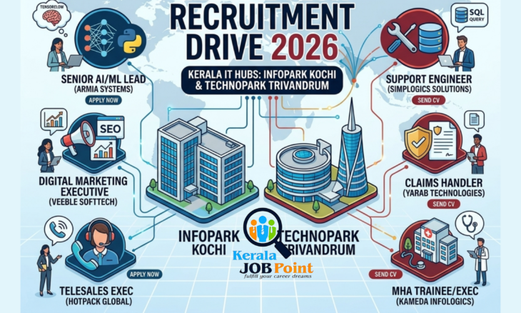 lists several IT and management vacancies at Infopark Kochi and Technopark Trivandrum, including roles such as Senior AI/ML Lead (Armia Systems), Digital Marketing Executive (Veeble SoftTech), Support Engineer (Simplogics Solutions), and MHA Trainee (Kameda Infologics). Other opportunities include Social Media Marketing at Exacore, Telesales at Hotpack Global, Claims Handler at Yarab Technologies, and Business Development Associate at Kenland IT Solutions