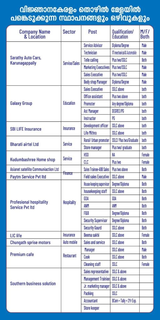 കേരള സർക്കാരിന്റെ വിവിധ വകുപ്പുകൾ സംയുക്തമായി ചേർന്ന് സ്വകാര്യ മേഖലകളിലെ വിവിധ ജോലി ഒഴിവുകളിൽ ഓഫീസ് സ്റ്റാഫുകൾ ഉൾപ്പെടെ ഒഴിവിലേക്ക് തൊഴിൽമേള സംഘടിപ്പിക്കുന്നു