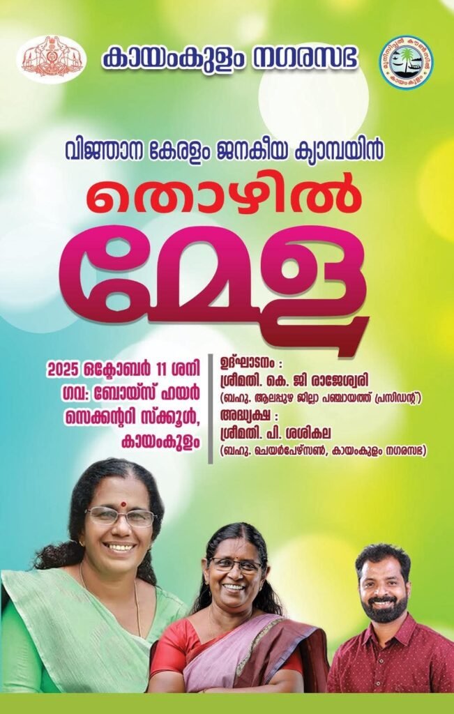 കേരള നോളജ് ഇക്കോണമി മിഷനും കെഡിസ്കും കുടുംബശ്രീയും മറ്റു സഹായക സംവിധാനങ്ങളും ചേർന്ന് വിജ്ഞാനകേരളം പദ്ധതിയുടെ ഭാഗമായി കായംകുളം ബോയ്സ് സ്കൂളിൽ വച്ച് ഒക്ടോബർ 11 ന് നടത്തുന്ന തൊഴിൽ മേളയിൽ പങ്കെടുക്കുന്നതിന് താഴെ തന്നിരിക്കുന്ന ഗൂഗിൾ ഫോം പൂരിപ്പിക്കൂ..