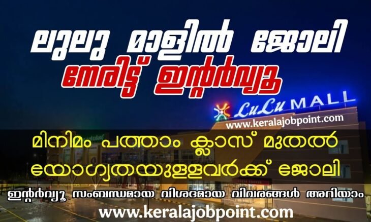 തിരുവനന്തപുരം ലുലു മാളിലേക്കുള്ള വിവിധ തസ്തികകളിലേക്കായി പത്തനംതിട്ടയിൽ വെച്ച് നടത്തുന്ന വാക്ക്-ഇൻ ഇന്റർവ്യൂ (Walk-in Interview) ഇതിന്റെ പ്രധാന വിവരങ്ങൾ താഴെ നൽകുന്നു:
