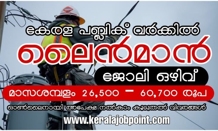 കേരള പബ്ലിക് സർവ്വീസ് കമ്മീഷൻ (KPSC), പൊതുമരാമത്ത് വകുപ്പിലെ (ഇലക്ട്രിക്കൽ വിഭാഗം) ലൈൻമാൻ (Lineman) തസ്തികയിലേക്ക് അപേക്ഷ ക്ഷണിച്ചു