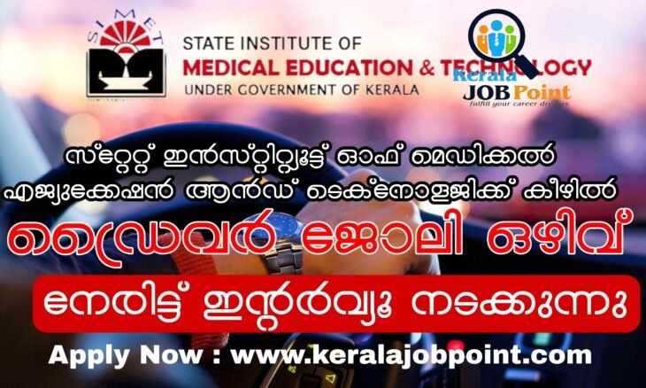 സിമെറ്റ് കോളേജ് ഓഫ് നഴ്സിംഗ്, താനൂർ (സ്റ്റേറ്റ് ഇൻസ്റ്റിറ്റ്യൂട്ട് ഓഫ് മെഡിക്കൽ എജ്യുക്കേഷൻ ആൻഡ് ടെക്നോളജിക്ക് കീഴിൽ). ഡ്രൈവർ ജോലി ഒഴിവിൽ യോഗ്യരായവരെ നിയമിക്കുന്നതിനായി നേരിട്ട് ഇന്റർവ്യൂ നടത്തുന്നു